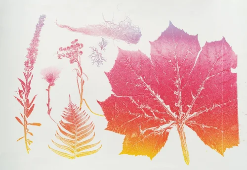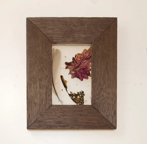 “Petal paper” was made by pressing petals in a print press together, then framed in glass.