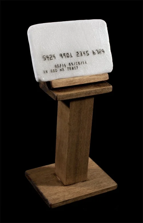 Changing an object’s material ultimately transforms how that object is perceived. I take mass consumerist icons like credit cards and cell phones and cast them in glass and chocolate as a social text on how sacred these objects are in our lives in 21st century America. Technology does not love you.