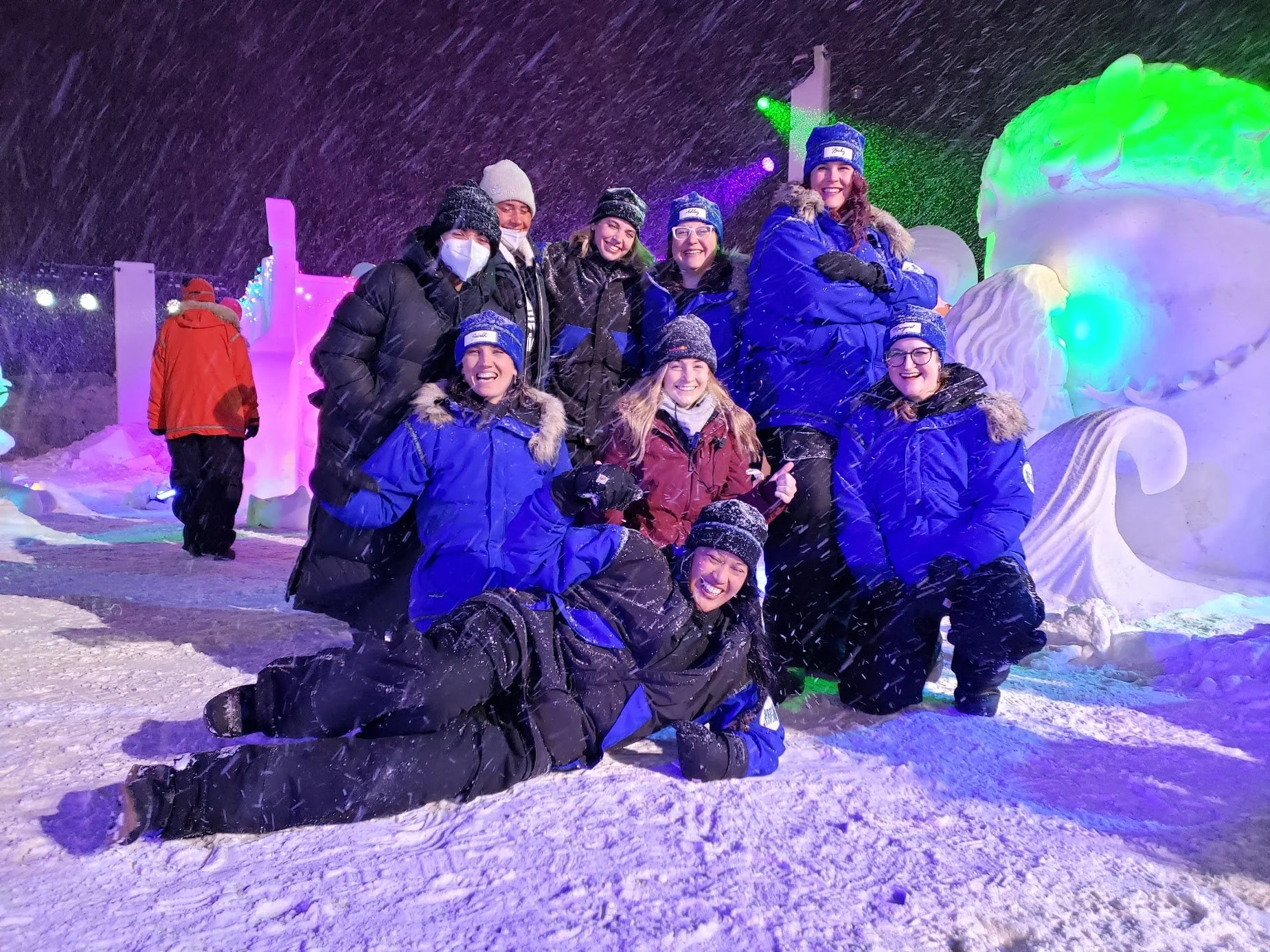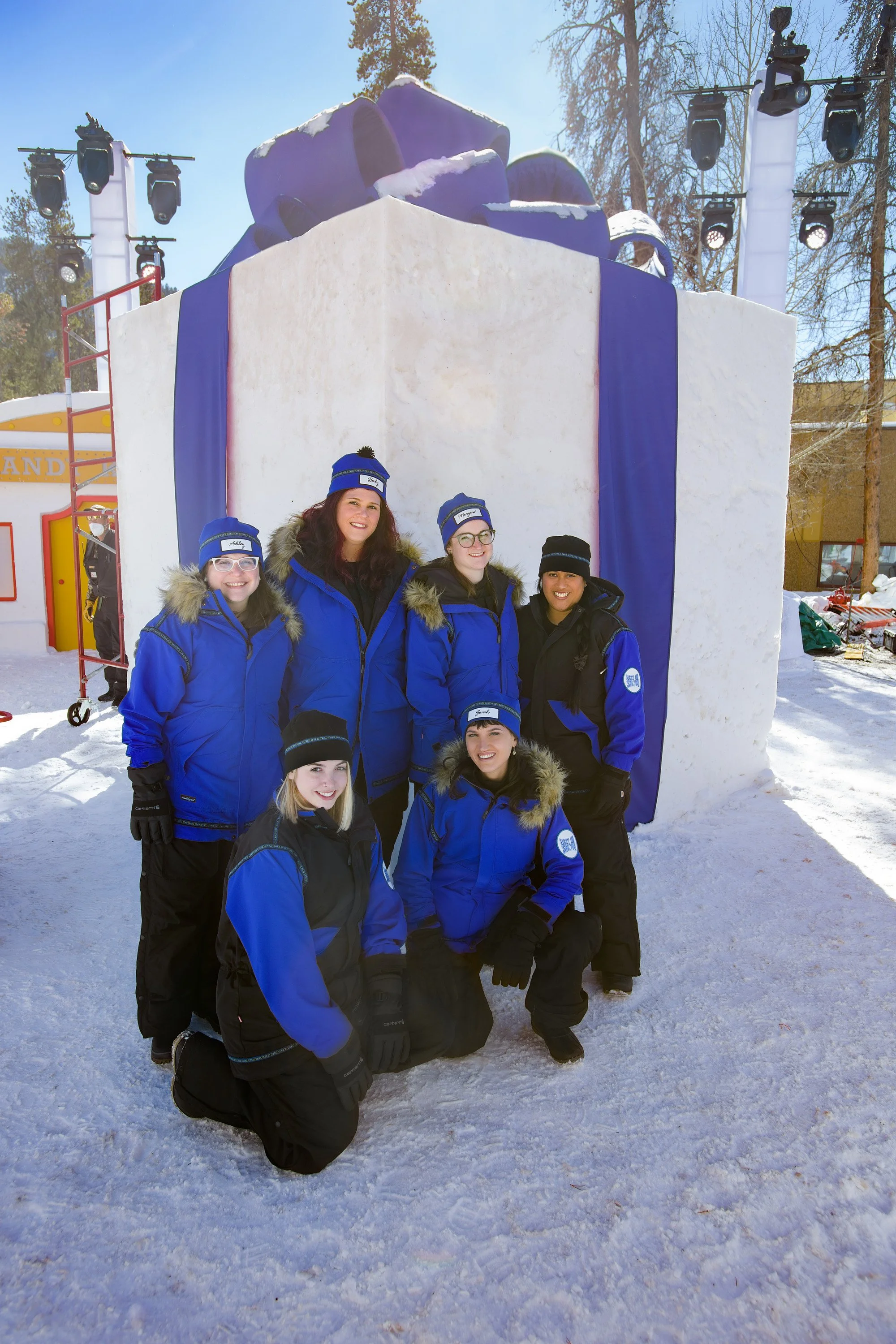 Snow Voyager Team/Blue Team with 20 tons of snow behind us (10 x 10 ft cube) Sarah is bottom right.