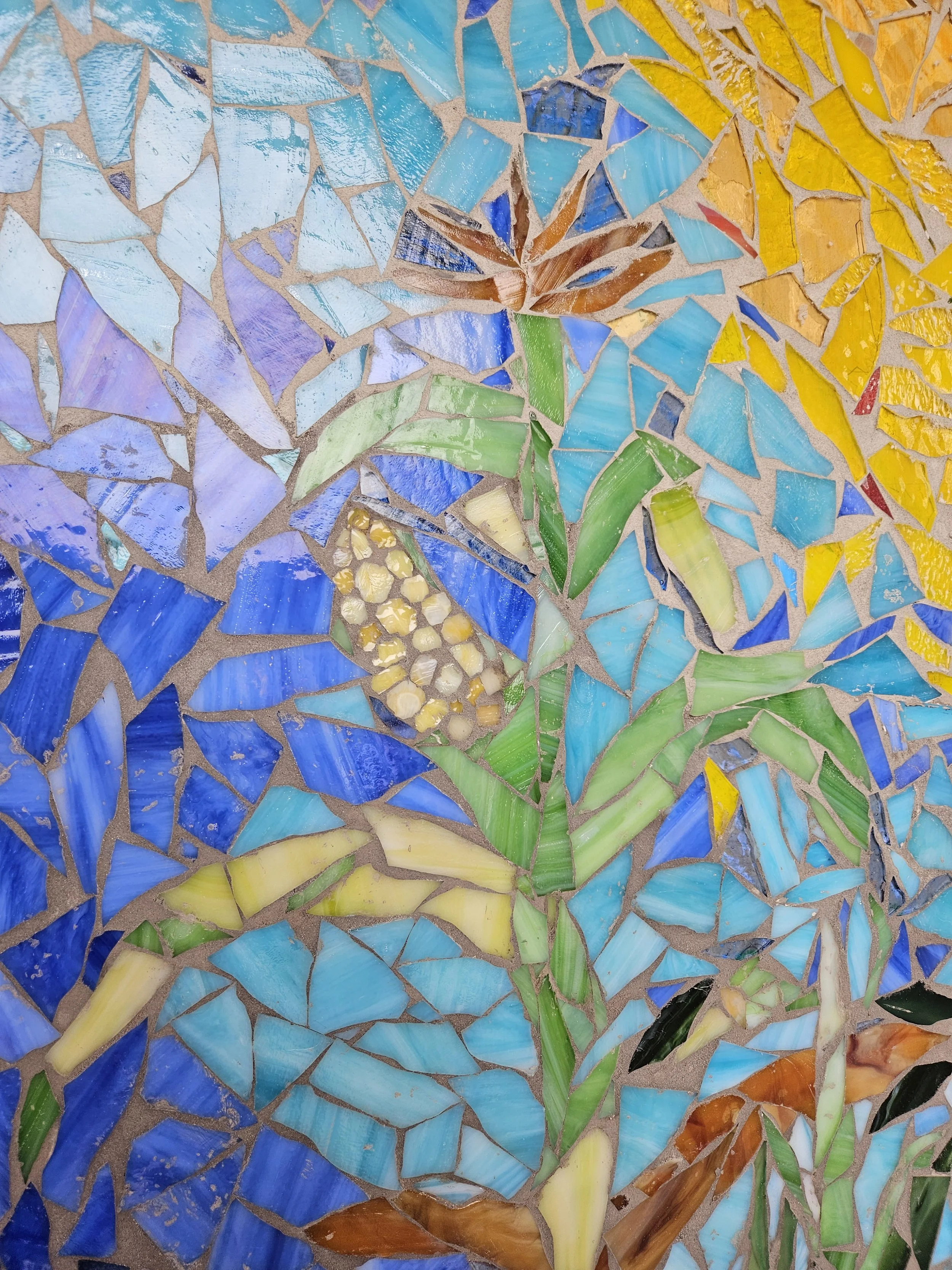 2023- 2024, Collaborative Mosaic with The Children’s Museum, Pittsburgh, PA, honoring the Three Sisters Crops, during Native American Heritage Month (November), which coincides with Fall crops and growth. The 3 crops, beans, squash, and corn, grow better together, and symbolize spiritual and cultural aspects, with a very long history- which is an understatement! We celebrated the month and the 3 crops by highlighting the roots as mirrored glass, to show the importance of these roots growing together and reflecting one another. The roots give each other nutrients to flourish, similar to the idea of community mosaic. When we work together, more can be accomplished, and we can nourish ourselves with community and sharing knowledge. We can see our hard work reflected. Thank you! The mosaic will be featured in the museum’s Fundraiser Gala so we can put money back into the arts program. After a few community work sessions at the museum, Sarah took the mosaic to her studio to finish it, grout it, and frame it with hardware for hanging.